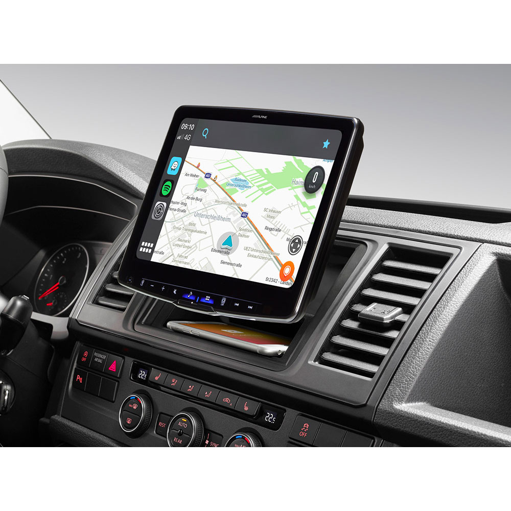 The iLX-F115D-T6 Alpine Halo11 for the Volkswagen T5 (7H/E/J) model year 09/2009 – 06/2015 and T6 (7H/E/J) model year 07/2016 – 09/2019 and more is a cutting-edge Head Unit, featuring a gigantic 11-inch high-resolution WXGA touch-screen. The iLX-F115D-T6 comes with all required installation parts (such as a plug-and-play wiring harness, CAN interface, frame, etc.) for the Volkswagen T6. The super-slim display appears to simply hover over your dashboard and can be adjusted in various ways for the best position.