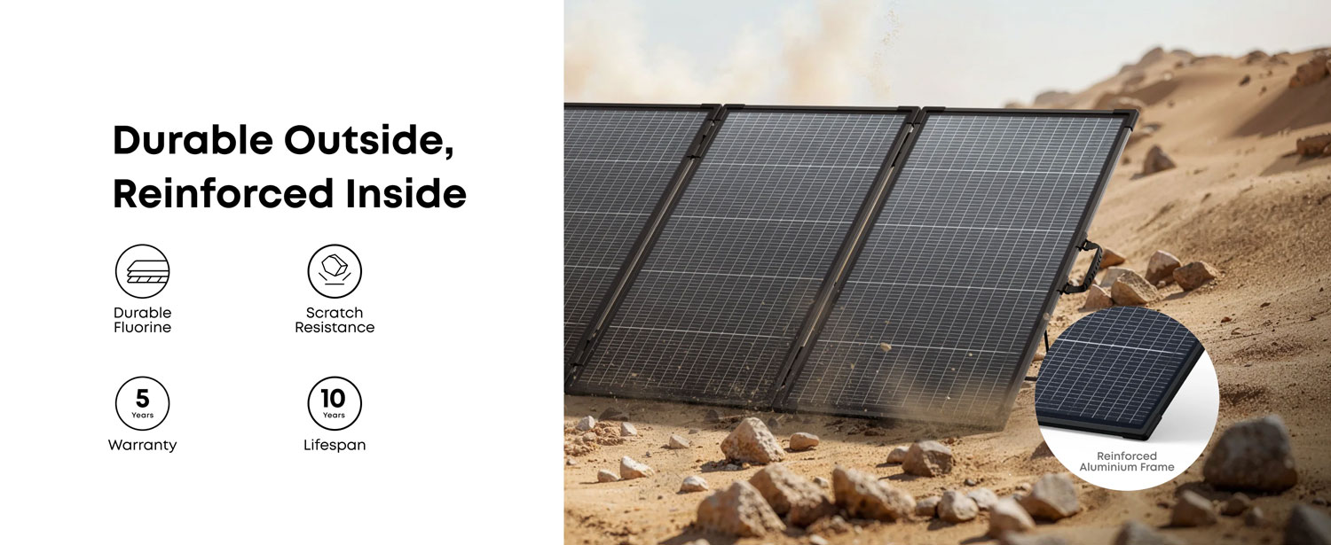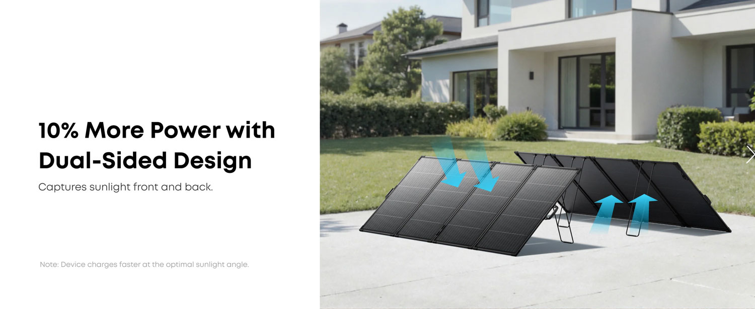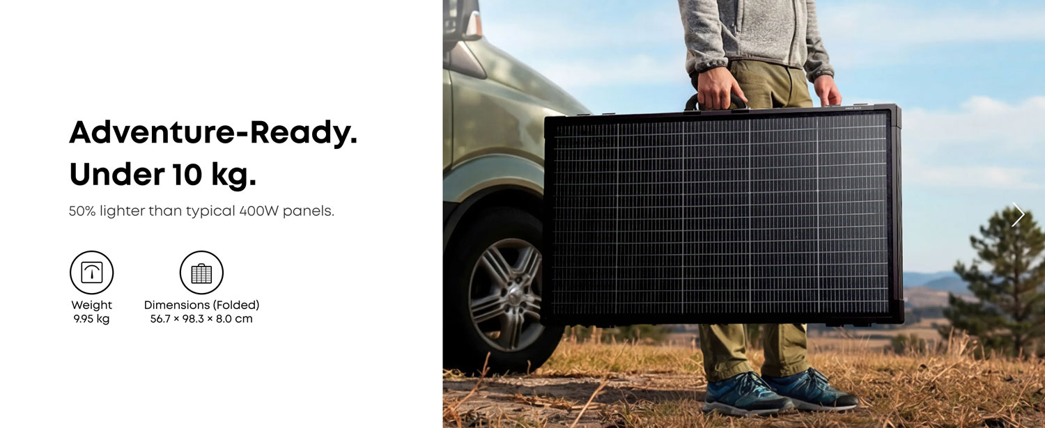 - Lightweight Design, Foldable Convenience: Now 10% lighter than the previous version—just 10 kg including the stand. Over 50% lighter than typical 400W panels, making it easier than ever to carry and set up.