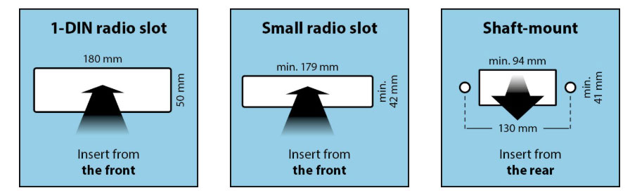 The device can be installed in various dashboard mounting slots. For example, mounting materials are included for axle mounting and 1-DIN mounting slots.