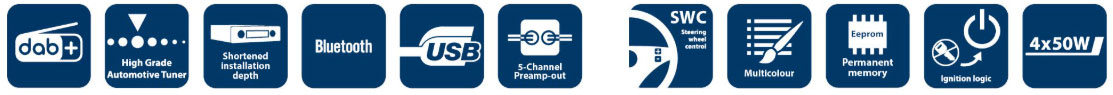 - FM, AM, DAB, DAB+ Tuner w. PS, AF, REG, EON, RT, CT, PTY, TA, Service following, DLS