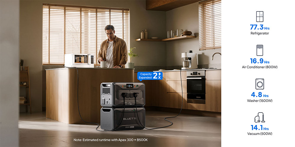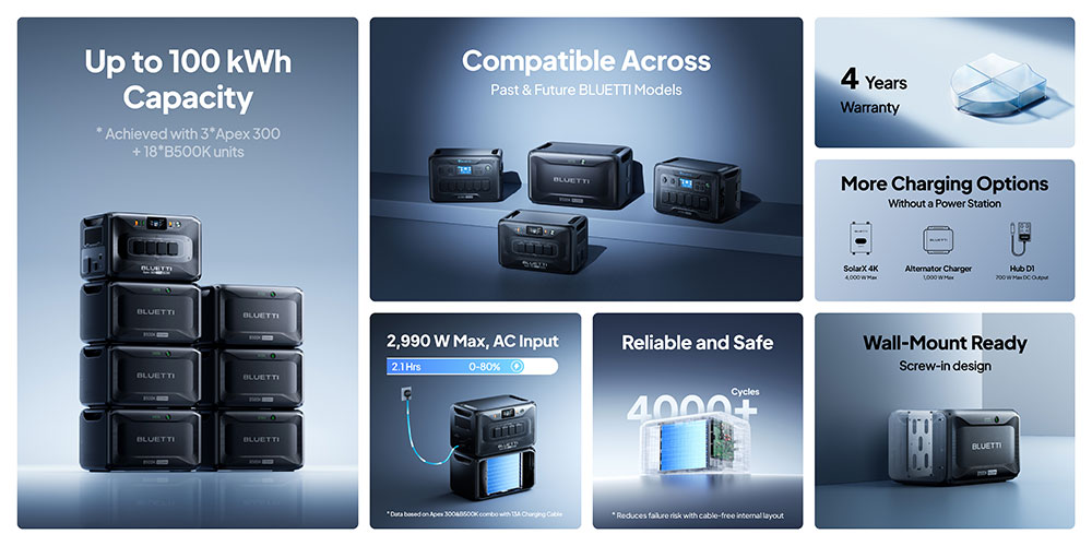 - Universal BLUETTI Compatibility: Works seamlessly with Apex 300, AC300, AC500, AC200L, AC200MAX, and upcoming models.
