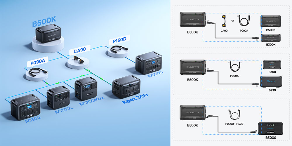 The B500K either expands your BLUETTI power stations or serves as a high-capacity power bank with ecosystem components, delivering 700 W DC output for your devices. *Note: P090D to P150D cable is required for connecting with AC500 and sold separately.