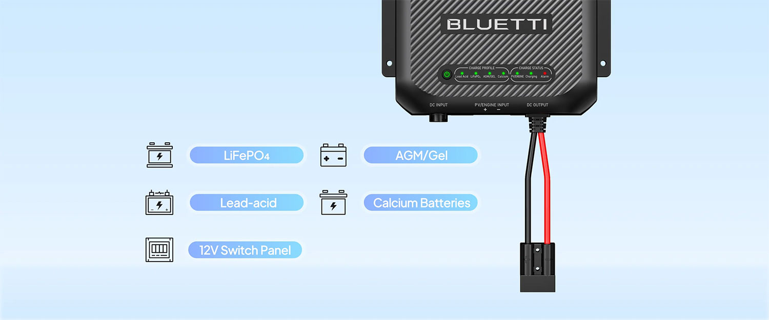 - Compatible with LiFePO₄, AGM / Gel, Lead-acid, and Calcium Batteries