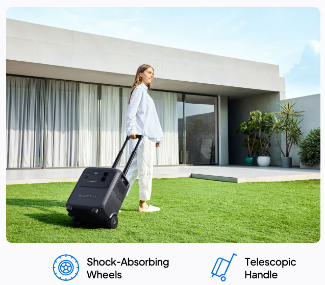 The Elite 320 is a movable, portable power station with 3,200 Wh capacity and 1,800 W output, providing reliable power for home backup, outdoor activities, and off-grid use. Its compact design with a telescopic handle and wheels makes it easy to move and deploy wherever power is needed.