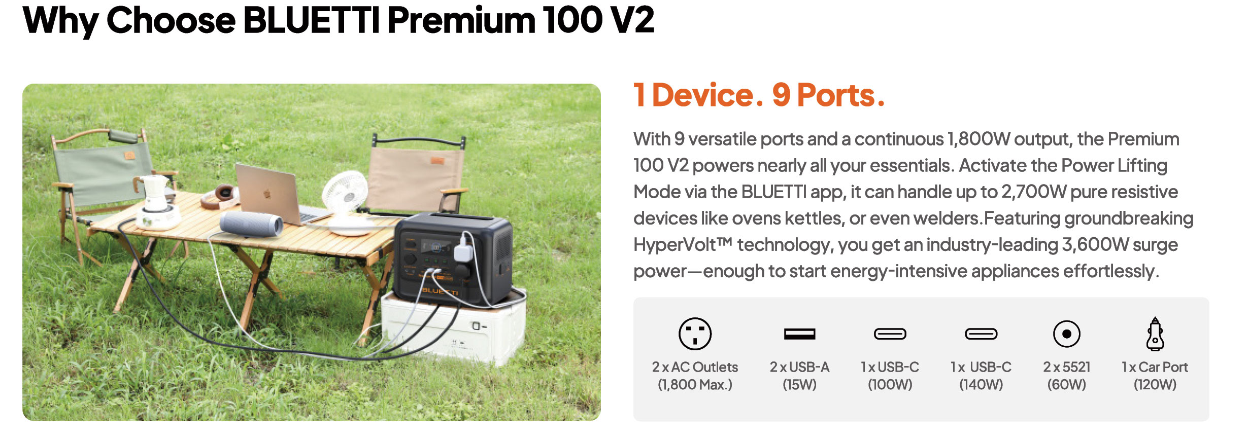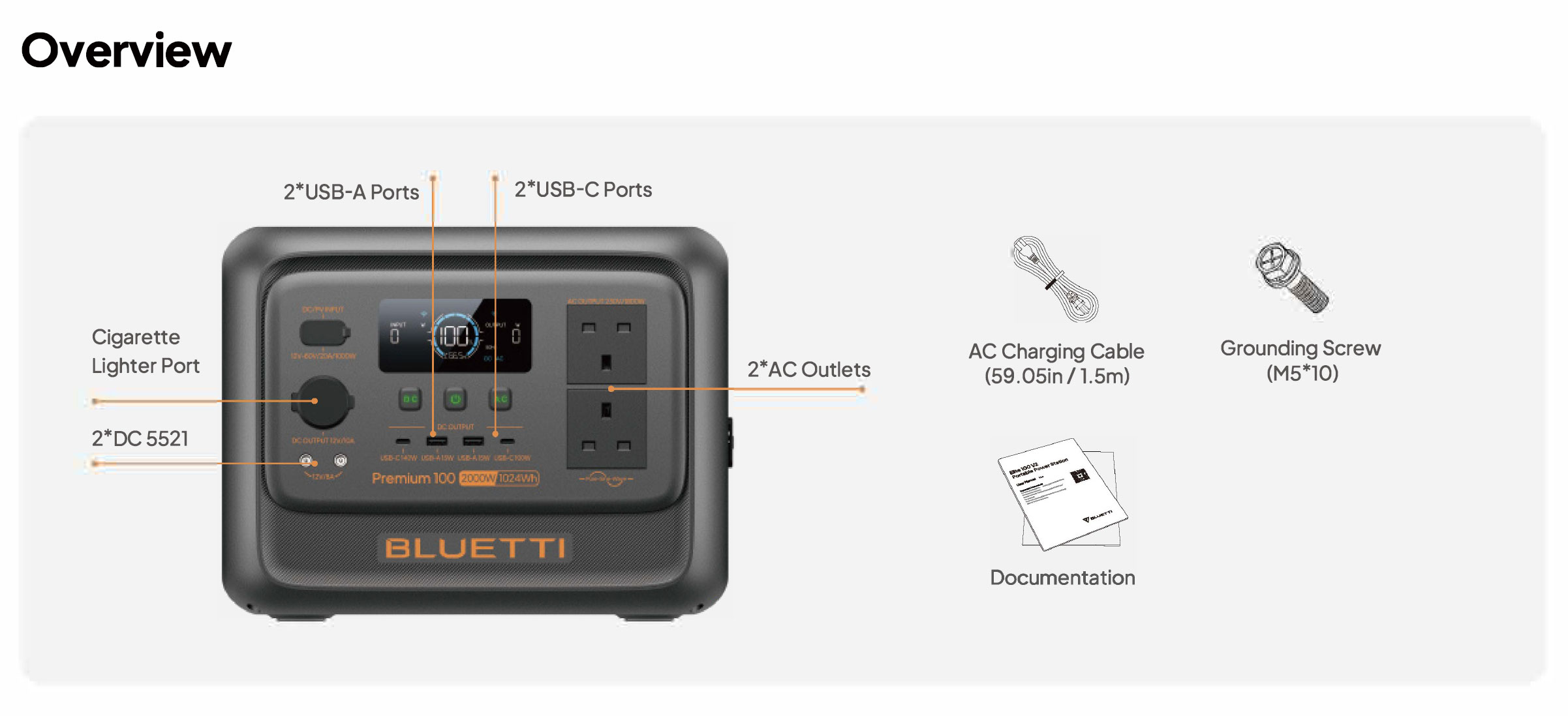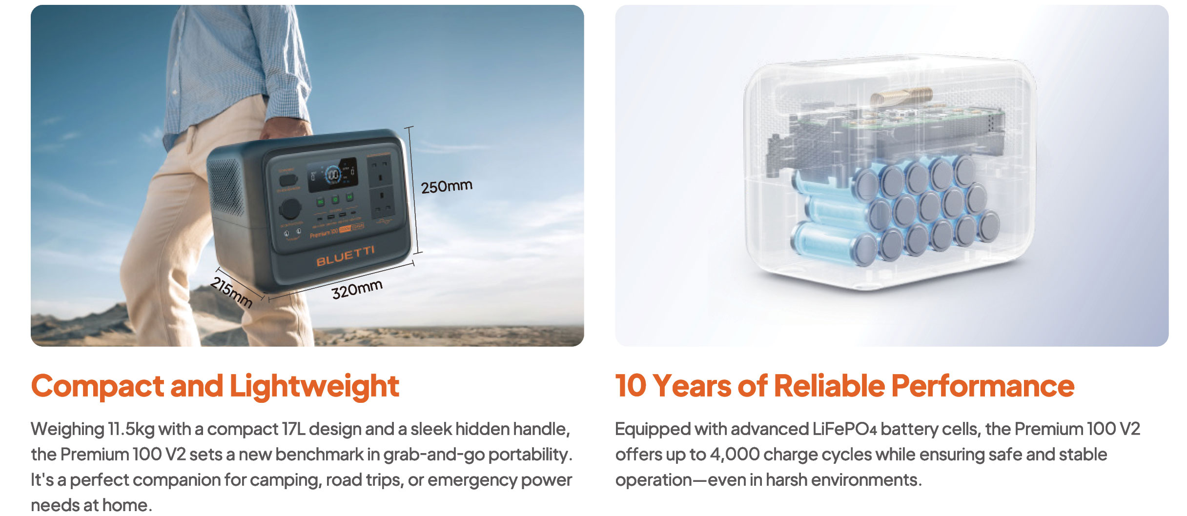 - BLUETTI PREMIUM 100 V2 AC/DC Portable Battery Power Station 1800W / 1024Wh (5 Year Warranty)
