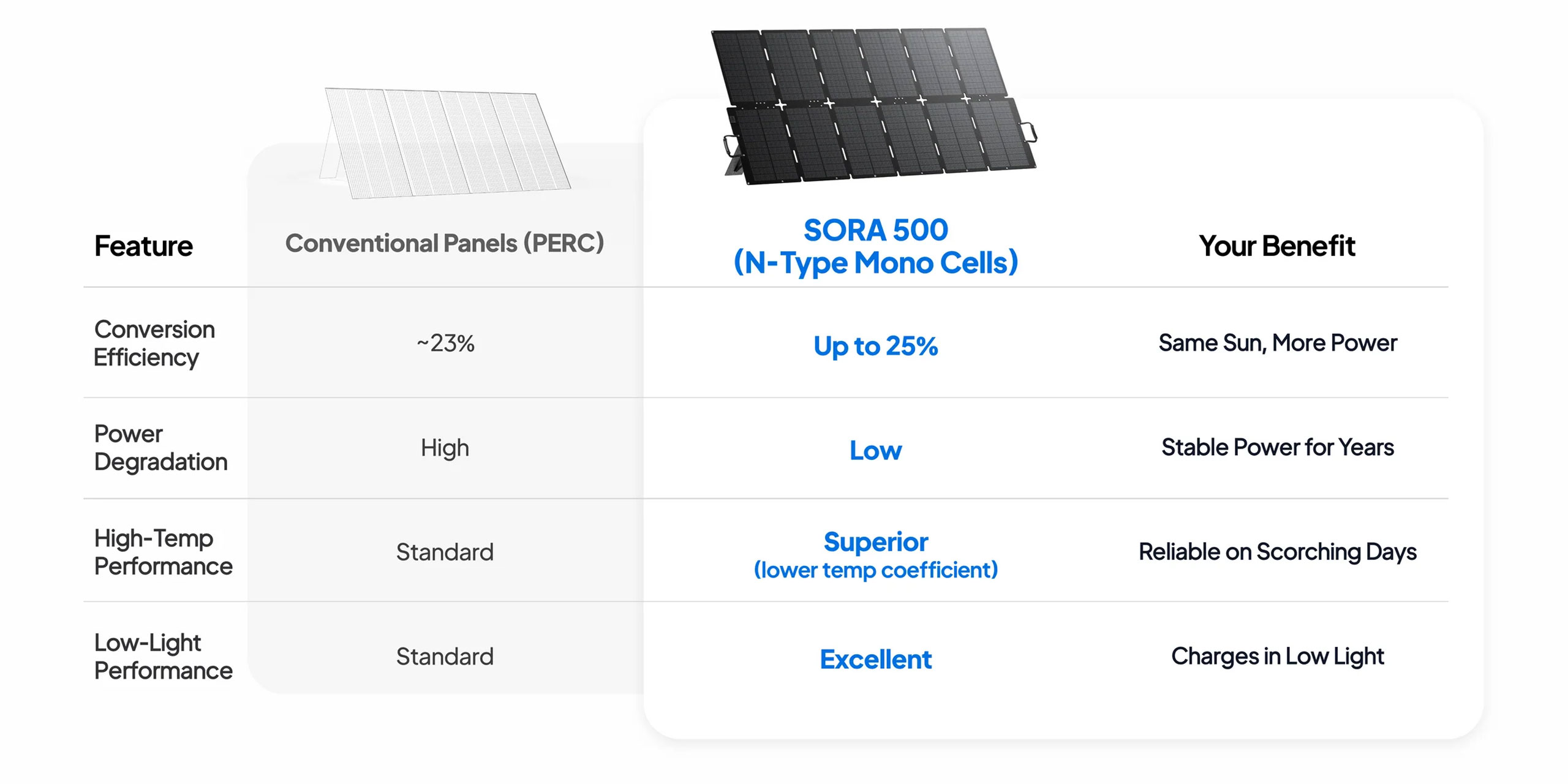 SORA 500 captures more sunlight, lasts longer, and performs better in extreme conditions. Don't settle for yesterday's technology.