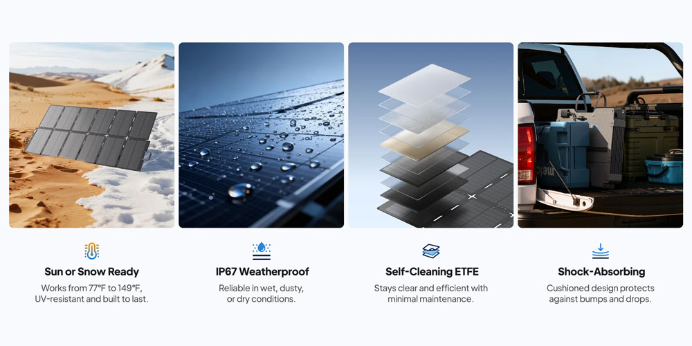 - Go solar anytime: It's IP67 water-resistant and reliable in heat and cold.