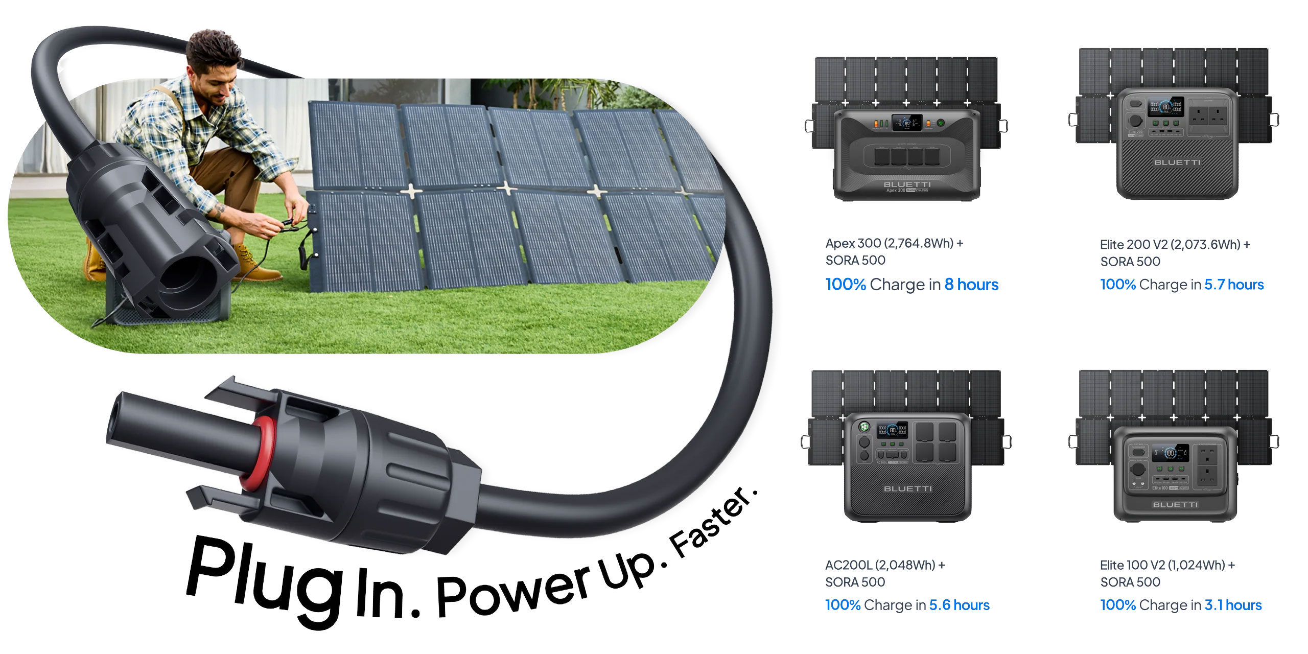 With a universal MC4 connector, SORA 500 works with almost any power station. Charge quickly, get back to adventure, and never wait for power again.