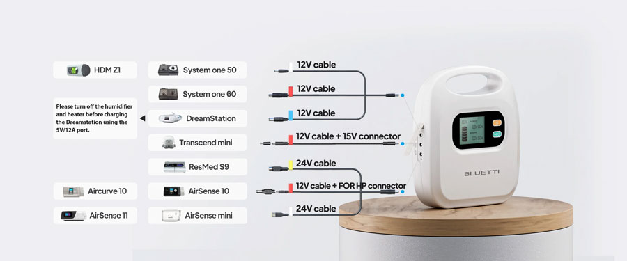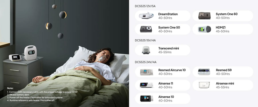 - Versatile recharging: CPAP, cellphones, laptops, etc.