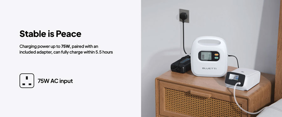 As a power bank for CPAP, the X30 boasts a sleek and stylish design, making it a perfect companion whether you're at home or on the go. Get it charged with AC outlets or car charging at your convenience; then your power is always ready whenever you need it most.