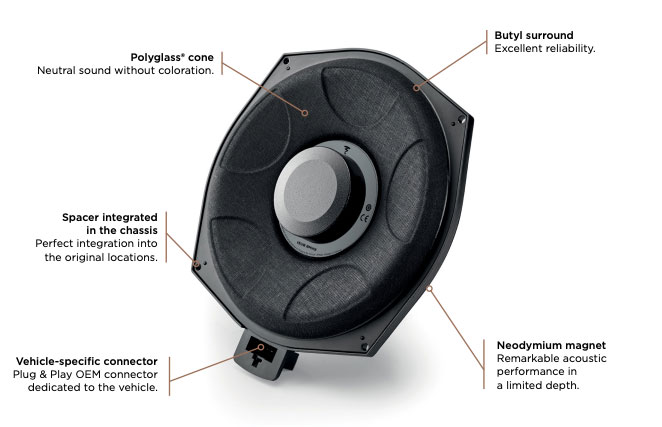 Experience powerful and precise bass with the ISUB BMW 8 subwoofer, featuring Focal's Polyglass membrane and a neodymium motor for high performance. The integrated interlocking mechanism ensures seamless integration into the original slots, providing an easy installation. With an 8-ohm impedance, this subwoofer is compatible with vehicles equipped with an audio option. It effortlessly blends in with other dedicated BMW/MINI kits, enhancing the in-car listening experience.