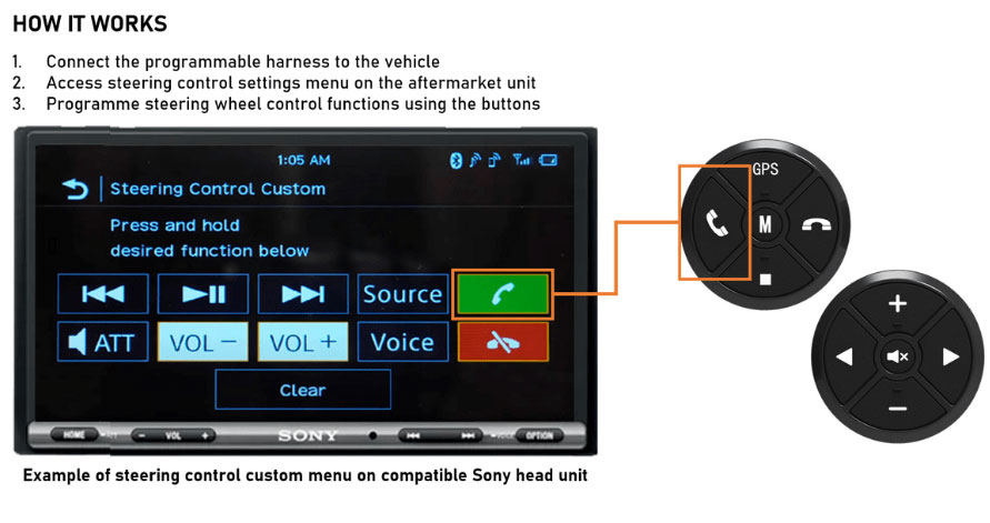 PLEASE NOTE: This kit is only suitable for aftermarket head-units with resistive programmable steering controls (KEY1, KEY2 or SWC1, SWC2) and 3.5mm jack.