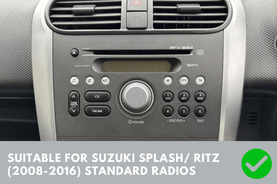 This stereo upgrade fitting kit is suitable for Suzuki Splash or Ritz (2008–2016) car models with factory steering wheel audio controls.