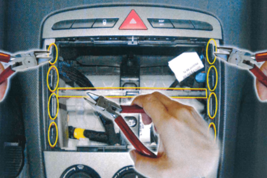 Some dashboard modifications are required behind the dashboard. These include cutting the centre bar and removing the 8 plastic tongues behind the factory radio (Please see below image)
