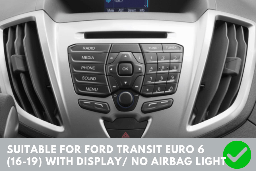 This kit is designed for Ford Transit MK8 Euro 6 (2016–2019) models with a factory display and passenger airbag light