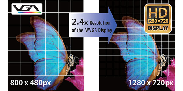 The HD display is about 2.4 times higher resolution than the conventional WVGA panel. With this display, jagged edges are eliminated in the displayed image, providing sharp and vivid images. In addition, the color development increases, and the individual colors of the image become clear, so you can enjoy high-definition images.