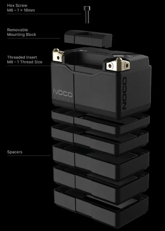 A removable mounting block allows the battery to fit more applications. The threaded insert enables direct-mounting for additional simplicity and security. Modular mounting spacers can be stacked and attached to the NLP batteries to alter the BCI size enabling the battery to be safely and securely mounted.