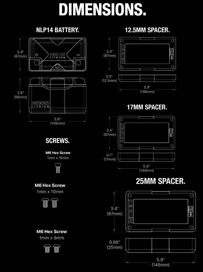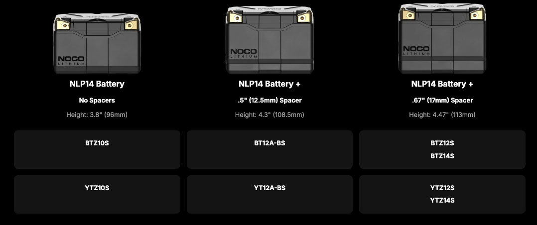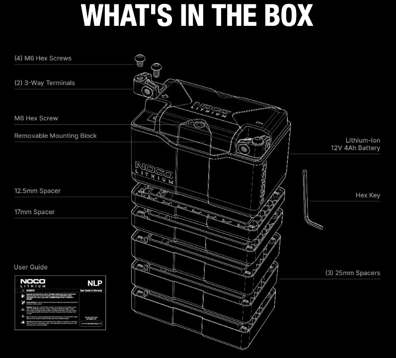 Introducing the all-new NOCO Lithium NLP14 12V Lithium Powersport Battery, a Group 14 battery, rated at 4Ah (51Wh) and 500-amps of starting power. It's better than lead-acid motorcycle batteries in almost every way: no sulfation, no activation, no acid, no maintenance, no water needed, and it comes fully charged and ready to install.