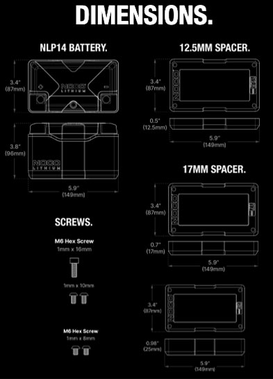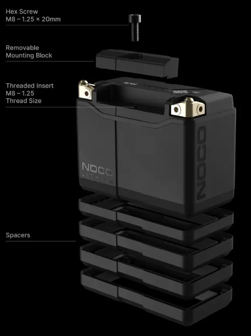 A removable mounting block allows the battery to fit more applications. The threaded insert enables direct-mounting for additional simplicity and security. Modular mounting spacers can be stacked and attached to the NLP batteries to alter the BCI size enabling the battery to be safely and securely mounted.