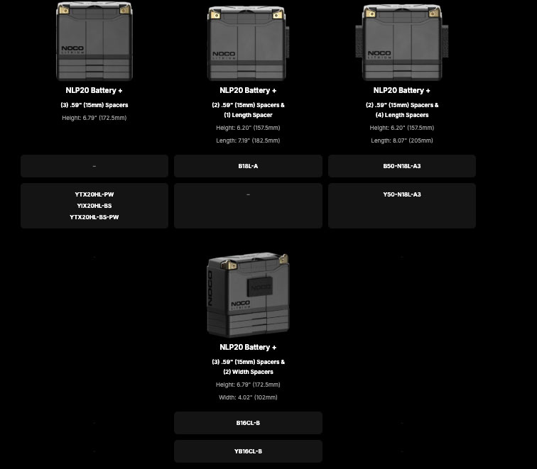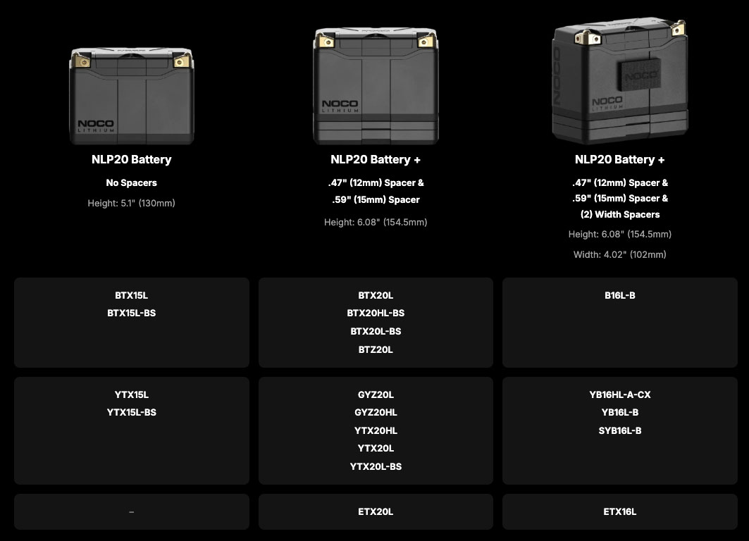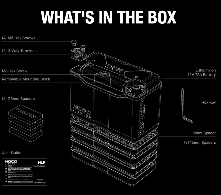 Introducing the all-new NOCO Lithium NLP20 12V Lithium Powersport Battery, a Group 20 battery, rated at 7Ah (89Wh) and 600-amps of starting power. It's better than lead-acid motorcycle batteries in almost every way: no sulfation, no activation, no acid, no maintenance, no water needed, and it comes fully charged and ready to install.