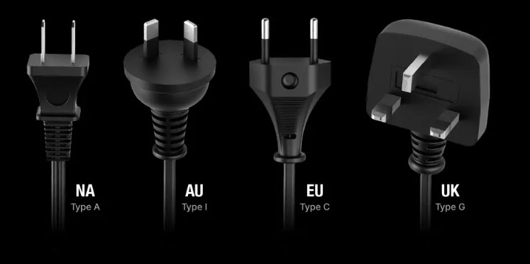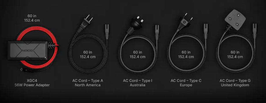 Includes AC cables for Australia (Type I), Europe (Type C), North America (Type A), and the United Kingdom (Type G) to accommodate all regions where NOCO Boost units are sold.