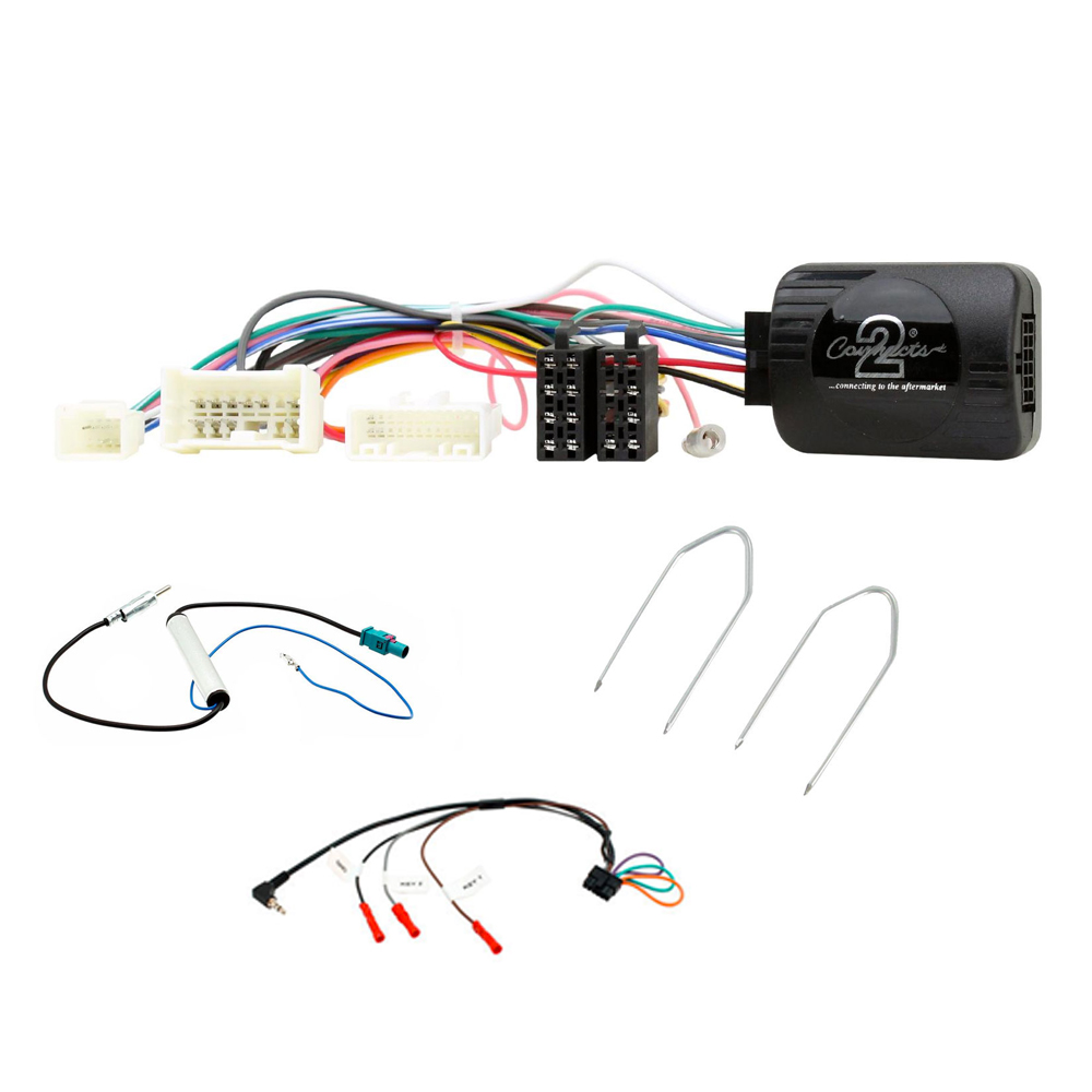 This kit includes Steering Wheel Interface, Radio Removal Keys, and aerial connections.